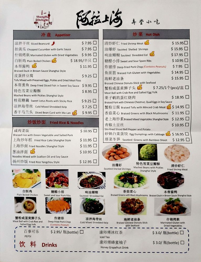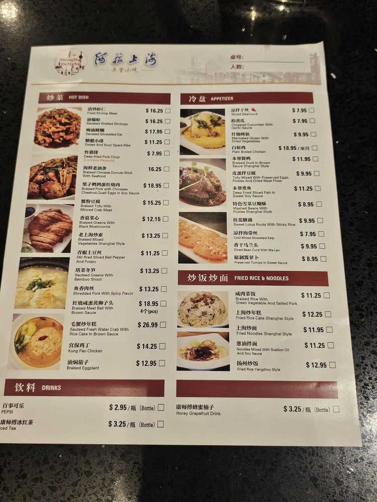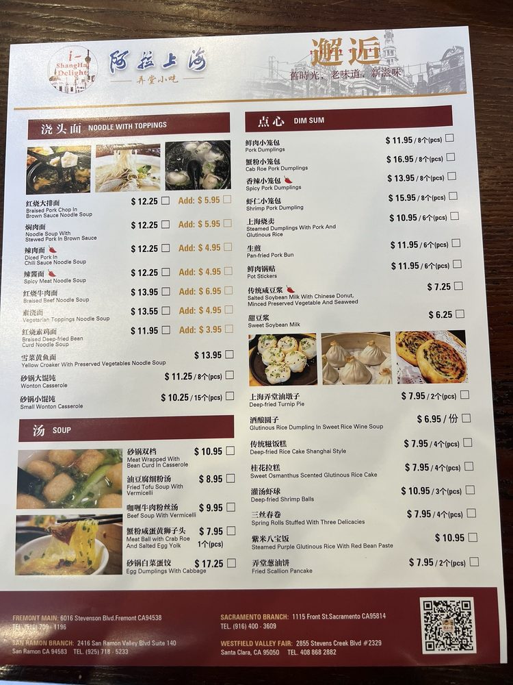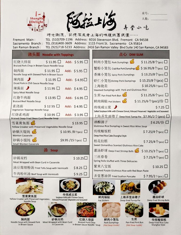 Introducing the menu at I-Shanghai Delight, a cozy and welcoming spot in Fremont offering authentic Shanghai-style dishes. The standout signature dish is the xiao long bao (soup dumplings) - juicy and flavorful, a must-try. Also, don't miss the sheng jian bao (pan-fried buns) with a crispy bottom and savory filling. The menu boasts a great variety of options, catering to different tastes.